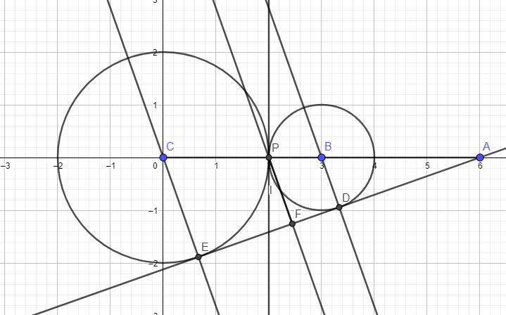 We can also construct similar triangles ABD and ACE where points D and E are the points of tangency of our line of interest and the two circles