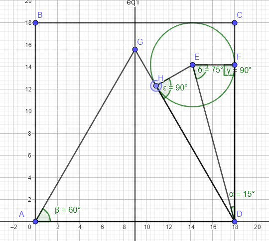 Side of square = CF + FD = radius of circle + x = [ 9 - 3sqrt (3) ] + [ 9 + 3sqrt (3) ] = 18