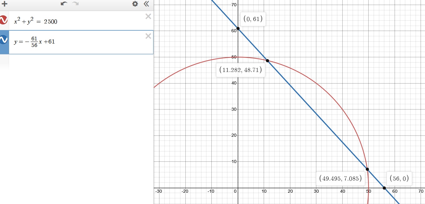 Line equation between cities y = -61/56 x -61 sub this into the circle equation to solve for x