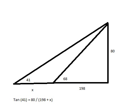 198 is found by tan 68 = 80/d then d = 198