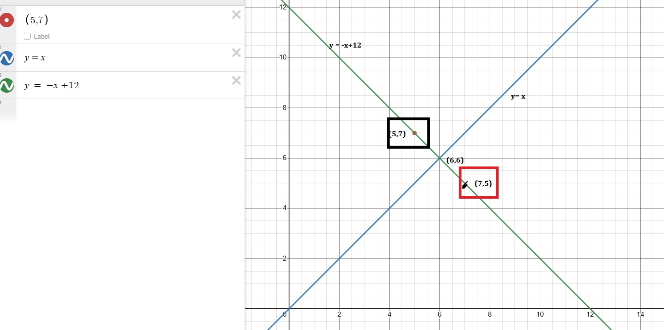 Intersection point is 6,6 ( found by equating y = x and y = -x +12 )
