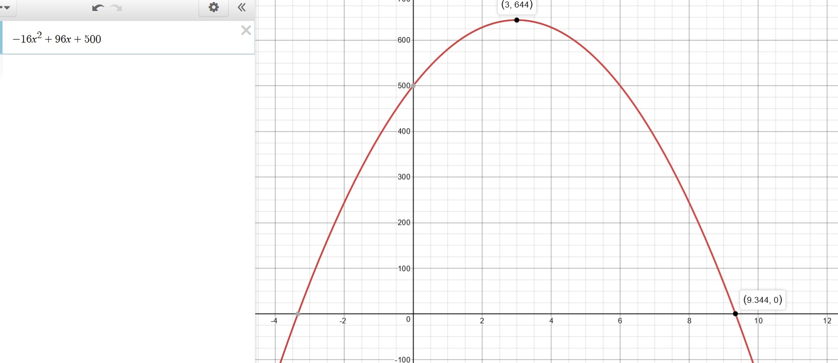 c 0 = -16t^2+96t+500 use quadratic fomual to find t=9.34 sec to the ground