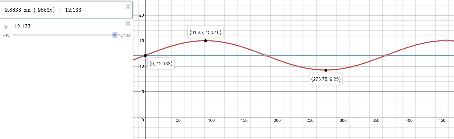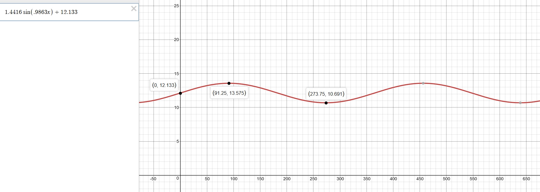 2.8833 (sin .9863x) + 12.133 and is shown here: